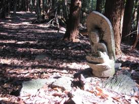 小さな石仏 8時33分 ふと足元をみると小さな石仏を見つけた。 登山者を見守ってくれているのであろうか? この道は平坦でとても歩きやすい。 落ち葉がたくさん敷き詰められた気持のよい場所である。落ち葉を踏む音がずっと続く。 |