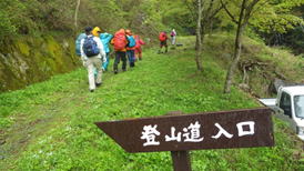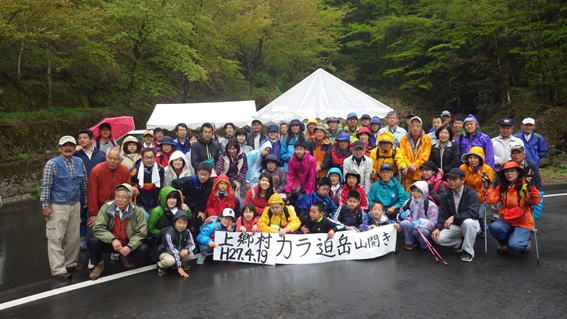 | 八女星野村にあるカラサコ岳の山開きに参加した。メンバーはT師匠、Y川さん、T井さんご夫妻、N村さん、Tさんと私の総勢7人。あいにくの雨だったが、70名程の参加者で賑わった。出発前に神事を終え、恒例の集合写真を撮影。今年は山開き10周年記念と言うことでお世話をされる上郷村の皆さんも嬉しそうだった。 |