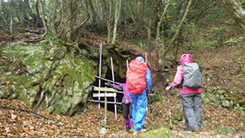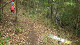 沢沿いの登山道を歩く 9時24分 しっとり濡れた落ち葉を踏み締めて・・・ |