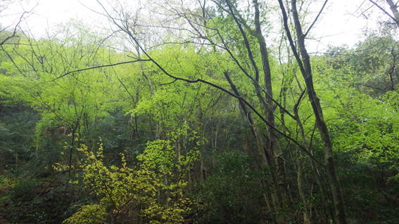 霧雨に煙る森だが、新緑の輝きは森を明るくしていた