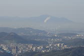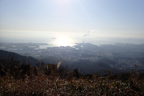 | 逆光だ!しかも霞がかかり残念。 9時47分 眼下は長府市街、海は瀬戸内の周防灘。 この展望台は午後の方が光の具合がよく、景色がよく見えるのでは? |