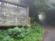 企救自然歩道の標識 8時22分 視界100メートル位だろうか?四方真っ白な霧に囲まれながら車道を上って来た。九合目辺りに大きな標識があった。ここから道も細くなり、車止めを過ぎると本格的な登山道になっている。まだ紫陽花が少し残っていた。 |
