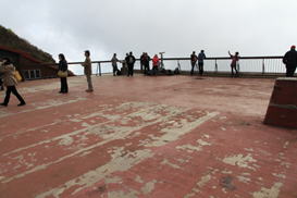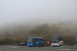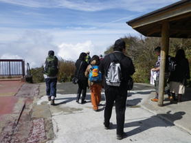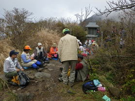 山頂から普賢神社の小広場を見下ろす 下を見ると、たくさんの人が昼食中。 私たちが合流すると、より混雑しそうな気がしたが、私達と入れ替えで団体さんは下山した。ラッキー。 昼食中も霧の中 |