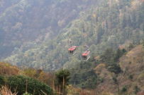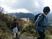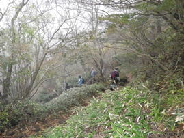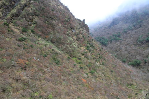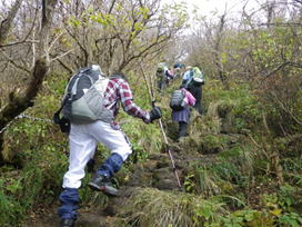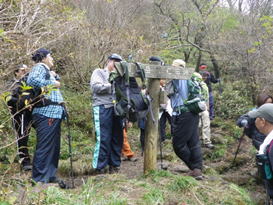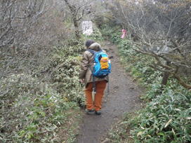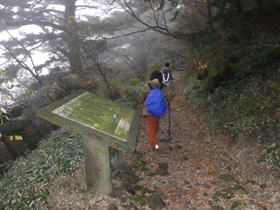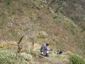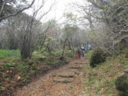 一気に下る 12時38分 ここから約100mをグングン下って鞍部の紅葉茶屋を目指す。 下るということは、最終目標の普賢岳にはその分また上るということで、もったいなく感じてしょうがない。 痛み出した膝をストックでカバーしながら、なるべくソフトに歩くよう心掛ける。 気が付いたらしんがりを務めていた(笑) |