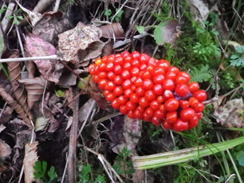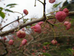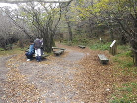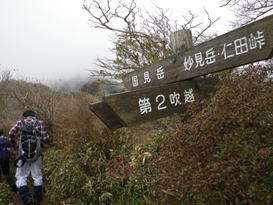 第2吹越への分岐を通過 11時49分 妙見神社から国見別れの間は約20分だが、この尾根歩きは眺望抜群の区間である。 しかし、今日は霧が発生して今一歩の景色である。 紅葉もほぼ終了していて、冬の訪れを感じる。 右手の眺望に気をとられ、歩くスピードが一段と遅くなる。 写真撮影等していて、気が付けば一人取り残されちょっと焦った。 |