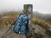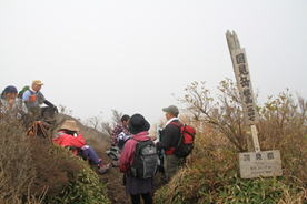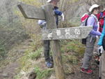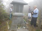 7、普賢岳山頂 13時16分 1359m 「着いたぞー」 しかし・・・あいにくの霧で平成新山の溶岩ドームはほとんど見えなかった。 山頂碑 |