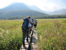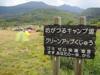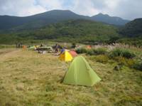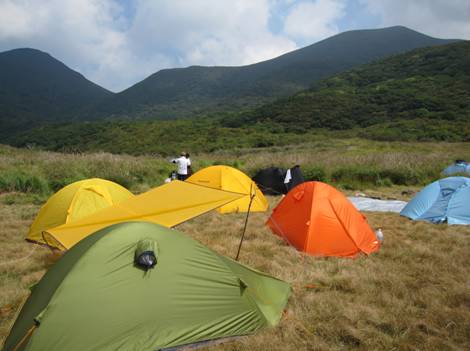 | 坊ヶつるキャンプ場 色とりどりのテントが並ぶ 1230m この一帯は湿性植物の宝庫で、2006年に湿地保全を目的としたラムサール条約に登録された。 |
