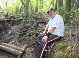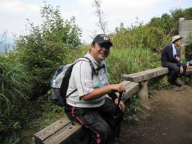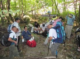 休憩中のM君 10時28分 樹林の中を進むにつれて、14人の集団が徐々にバラバラになっていった。 やはり個人個人のペースが違うようだ。 最初は絶好調だったM君も次第にペースダウン。無理をせず休憩を多く取りゆっくりと登った。 この時、減量と禁煙を誓ったとか?(笑)