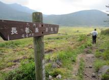 タデ原(湿原)を歩く 9時38分 タデ原(湿原)に突入。板の上を気持ちよく歩いて行く。坊ヶつるまで4.7キロの表示がある。