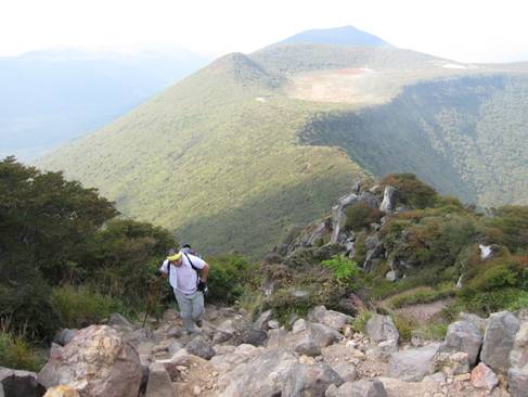 9、すがもり越え 9時07分 1505m 今歩いてきた道。遠くに昨日登頂した大船山が見える。すがもりの鐘の下でしばし休憩。