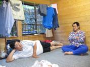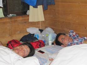 7、法華院温泉山荘 1303m 17時03分 やっと山荘に入り、落ち着いた表情。「もう動きたくありません」って、見たらわかります。
