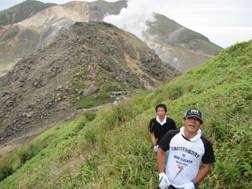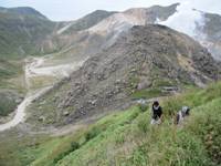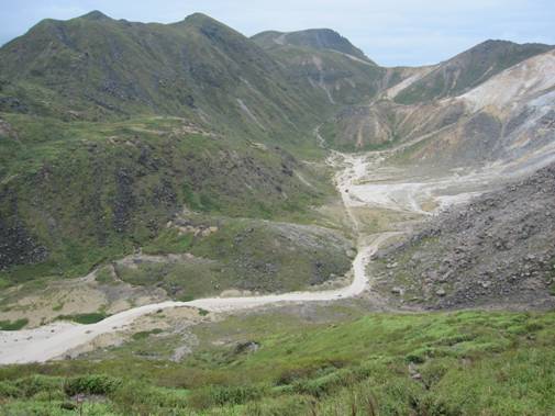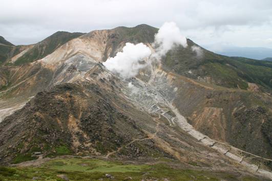 三俣山山頂より 噴煙を吹き上げる硫黄山。鉱山道路が見える。