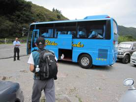 12、大曲り 11時26分 道路を渡るとバスがお出迎え。 全員無事に下山完了。山の神様に感謝。