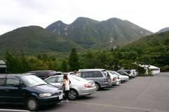13、星生温泉 山恵の湯 11時36分 駐車場は満車。遠くにさっき登った三俣山。