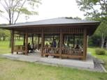 長者原で昼食 13時00分 長者原の駐車場裏の休憩所で昼食。法華院温泉山荘の弁当をひろげる。出来れば山の中で食べたかった。