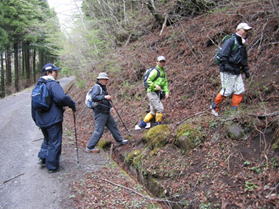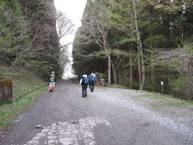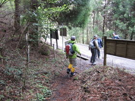 5、大船林道に飛び出す 10時20分 看板の横の道から飛び出て右へ進む。 |