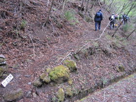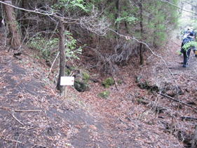 暮雨の滝への分岐 15時50分 ここから「暮雨の滝」へ下る。黒土がズルズル滑り、とても危ない急坂になっていた。 足下の標識 |