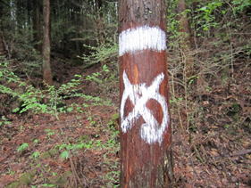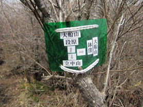 登山口近くで見つけた表示 16時44分 あと少しで登山口。最後まで慎重に。 倒木 |