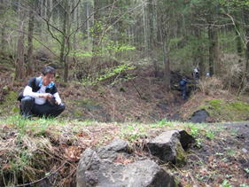 暮雨の滝コース分岐 15時24分 ここから「暮雨の滝」を経由して登山口に向かう。 足下注意 |