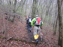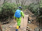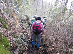 暮雨の滝分岐を出発 16時10分 なだらかな道が続くが、途中から急坂を下ることになる。午前中の雨でぬかるんでいる。 落ち着いて |