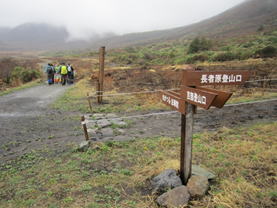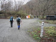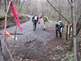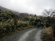 6、広場に出る 10時41分 この広場には法華院温泉山荘の自動車が置いてある。8号離合場所の立看板がある。 小雨が続く |