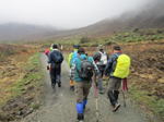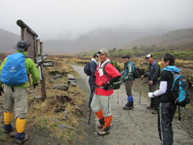 | ところが、ここで約30分休憩した後 「いざ大船山へ出発」 と外に出たとたん、さっきより更に雨が強くなり、しかも吹き飛ばされるほどの風が吹いていた。 大船山方面を見ると全く山は見えず、思わすお互い黙って目を見合わせ(お互いを思いやって)・・・ 結局大船山への挑戦を諦めることにした。残念だった。 この時点ではこれがベストな選択だと自分に言い聞かせて、泣く泣く、他のメンバーがいる法華院温泉山荘に向かった。 |
