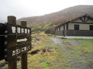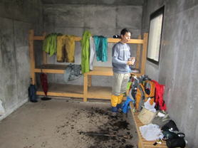 9、管理休憩舎 11時16分 ここで大船山に挑戦する前の腹ごしらえをして、レインウェアをしっかりと着込んだ。 |