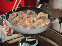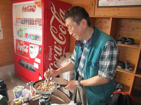 シェフK庭君の腕の見せ所 12時09分 さすが料理人いろんな調理道具を持参している。 |