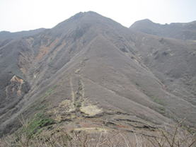 白口岳と鉾立峠 13時06分 立中山の中腹あたりから登って来た道を見下ろすと、直下に鉾立峠、正面に白口岳の全貌が見える。 山頂まであと少し |