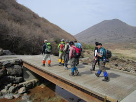 下山開始 14時49分 記念撮影も終わり、法華院温泉山荘に別れを告げ、坊ヶツルへ向かった。平治岳も見える。 木道を歩く |