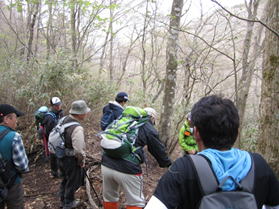 | 半年ぶりの同級生登山である。「年に一度は登ろう」と言いつつ、皆さん登山に目覚めると山行き回数も増えてくる。聞くと、それぞれ個人的にも時々山行きを楽しんでいるようだ。 吉部登山口から大船山を目指して出発。しかし、途中の雨で予定が大幅に変わってしまった。 |