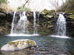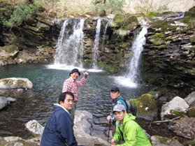 暮雨の滝で記念撮影 16時00分 マイナスイオンが豊富だ。 気持ちいい〜。 |