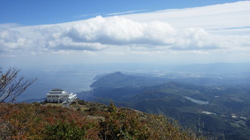 マイクロバスで登山口近くの駐車場まで乗入れた。火男火売(ほのおほのめ)神社からの急登を一気に上り、全員無事に登頂。この日の山頂は強風に加え6℃という冷え込みでじっとしていることが出来ない。しかし、お天気はよく別府湾も隣の由布岳もバッチリ見る事が出来た。下りはロープウェイ利用者と分れたが、7人でロープウェイ組に負けじと一気に駆け下った。