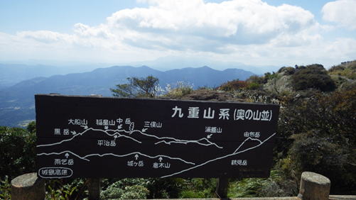 九重山系の説明表示  13時07分 雲がかかっているが、うっすらと九重の山並みが見える