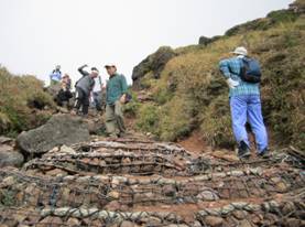 東峰から下界を望む 13時30分 幸いなことに一瞬霧が晴れた。 出発した由布岳の正面登山口がよく見える。 すかさずシャッターを切った。 お腹が減った。 マタエに下りて昼食タイムにすることにした。 |