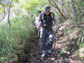膝をかばいながら自力で下山 15時03分 テーピングが功を奏したのか? ダブルストックで、何とか歩ける! 「ガンバレー!」