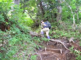 急坂の樹林帯を進む 6時06分 進むにつれ徐々に本格的な登山道となる。