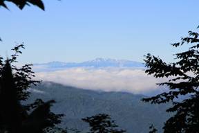 加賀の白山 6時44分 木と木の間から綺麗な山が現れた。 雪がまだ残っている。 雲海と山がマッチしてとても美しい。 |