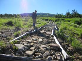 テント場が見えてくる。 5時48分 木道を進んでいくと一旦下りになる。