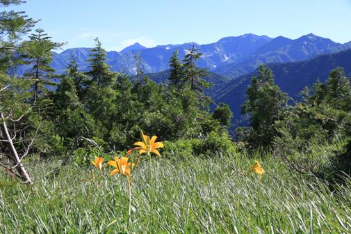 気持ちよく風にそよぐニッコウキスゲ。(バックは剣岳と立山) 7時39分