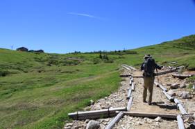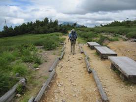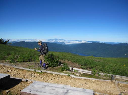 整備された登山道 7時33分 三角点から少し歩くと、展望が開けた登山道となった。ニッコウキスゲの「黄色」が目を引く。