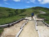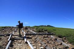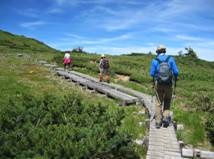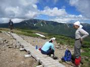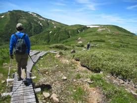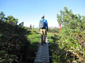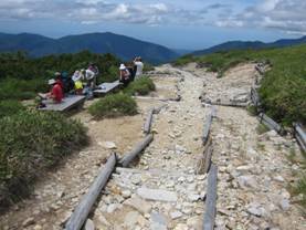 北ノ俣岳を下山開始 13時15分 少し下ると木道で景色を楽しみながら休憩している登山者を見かけた。