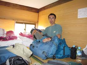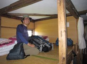 部屋に案内してもらう。 10時26分 二段になった四畳の部屋だった。天井が近い。畳一枚が自分のスペース。私達の下は、外人さんだったが、果たして寝ることができたのだろうか? 人が多い場合は畳一枚に二人で寝るそうだ。(本当だろうか?) ここに荷物を置いて、サブザックに換えて、北ノ俣岳を目指すことにした。 |