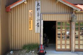 太郎平小屋の看板に別れを告げる この看板は山岳文学「山と渓谷」の著者でも知られる登山家・田部重治の直筆である。