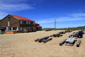 部屋(畳一枚)に戻って休憩 15時36分 お風呂がないので、水で頭を洗い、ボディーペーパーで汗を拭いて着替えた。 5時から夕食なのでそれまで小屋前の広場でゆっくりと過ごした。売店で缶ビール(500円)、缶チューハイ(400円)を買って飲んだ。 広場では今日一日の登山客の満足そうな話し声が聞こえてくる。 |