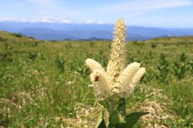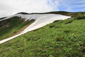 なだらかな木道が続く 11時07分 コバイケイソウがあちこちに咲いている。 北ノ俣方面に向かう登山者はあまりいない。 登山道付近の花の撮影をしながらのんびり歩いた。 歩き易い木道が整備され、苦もなくずっと歩く。 徐々に雪渓が近づいてくる。北ノ俣岳の山頂はまだ見えない。 |