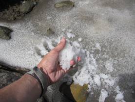 雪渓の氷で涼をとる。 13時30分 足元の雪渓から雪(ザラザラとした氷)を手にとり、首筋にあてる。なんと気持ちいいことか。