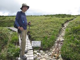 樹林帯を抜け出ると、そこは三角点。日差しが強い。折立登山道から約500mの標高差である。 |
