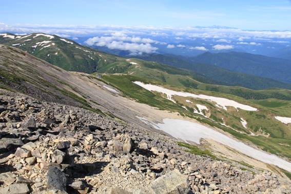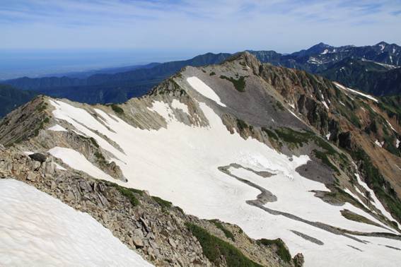 雪渓が残る北ノ俣岳の斜面 12時31分