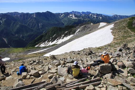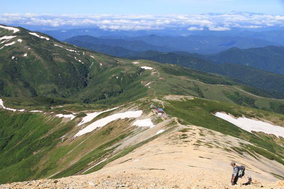 昨日登った北ノ俣岳(左の雪渓のある山)と宿泊した太郎平小屋が小さく見える